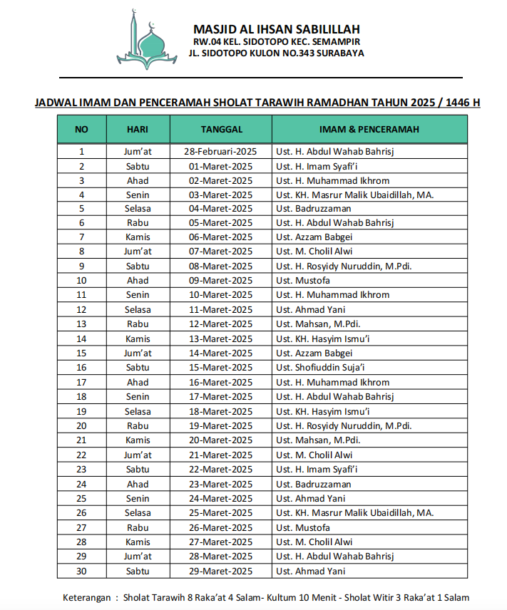 Jadwal Imam Tarawih Ramadhan 2025 / 1446 H